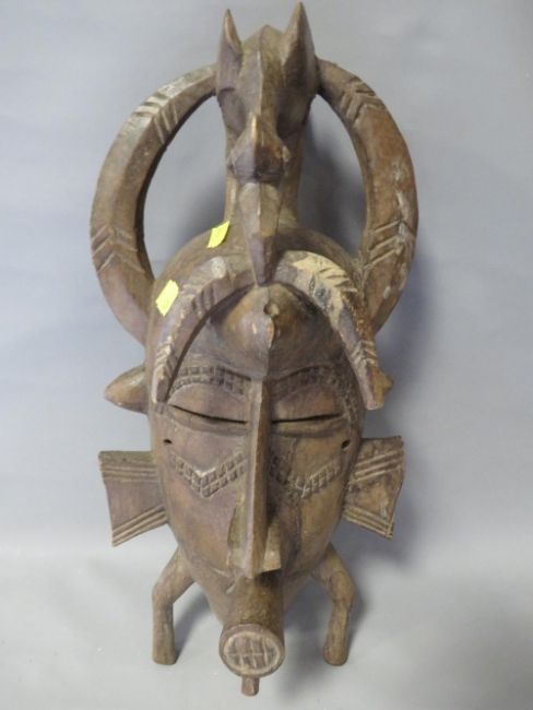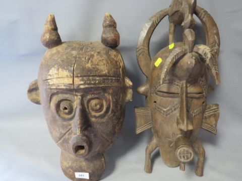 A large African tribal art Senufo Ivory Coast tribal mask and a large Congo Luba helmet mask