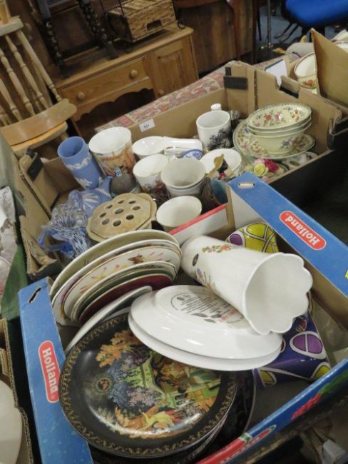 Two trays of assorted ceramics to include Wedgwood jasperware and collectors plates