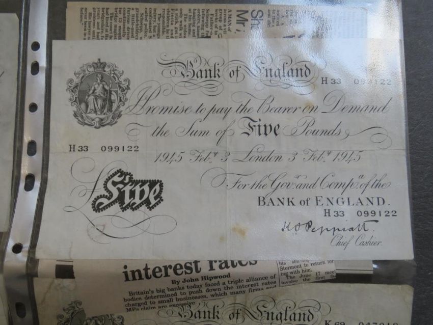Bank of England white five pounds - Peppiatt Feb 1945 and Nov 1945 and Beale August 1951 and a cut cancelled Durham Bank 1879 five pounds (4)