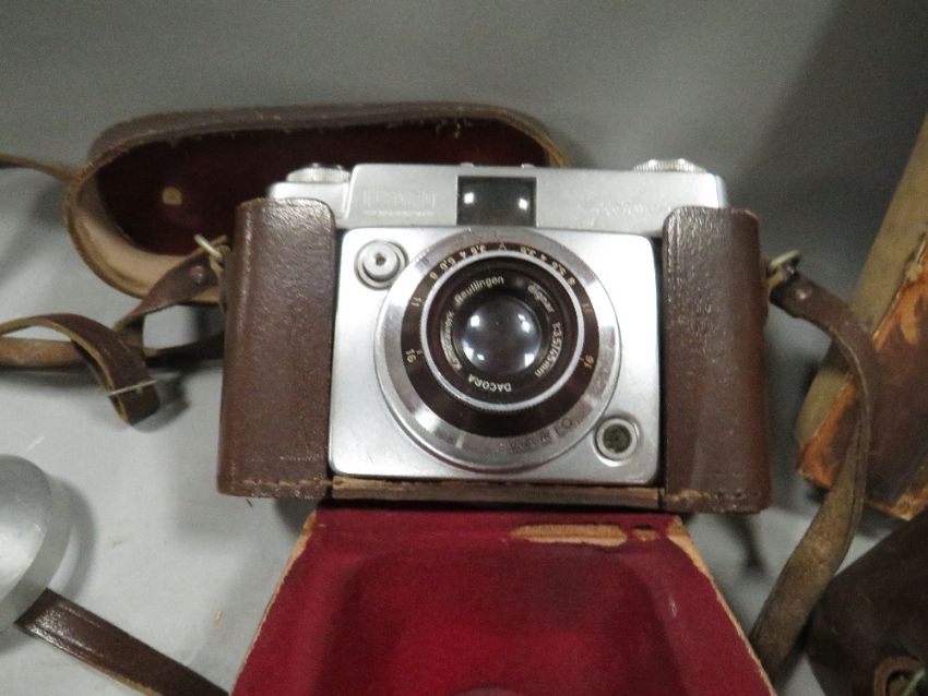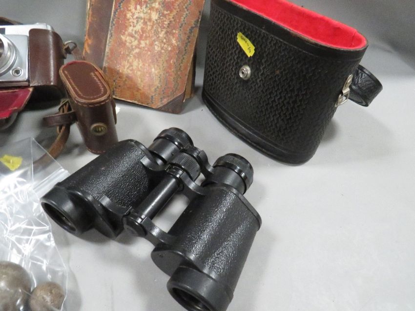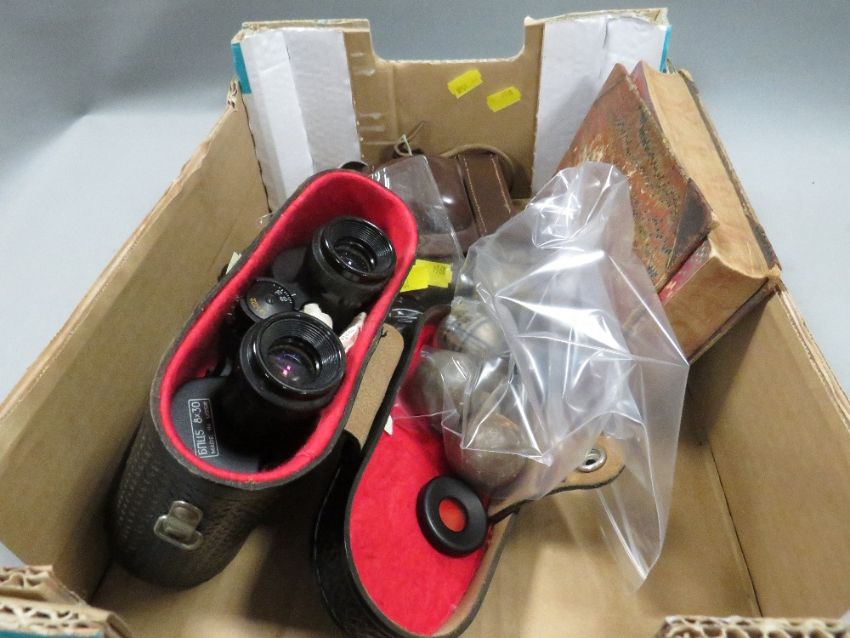 A tray of collectables to include camera and binoculars