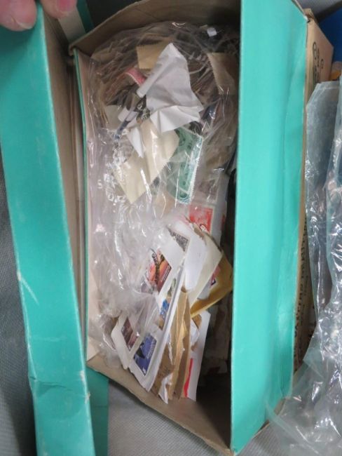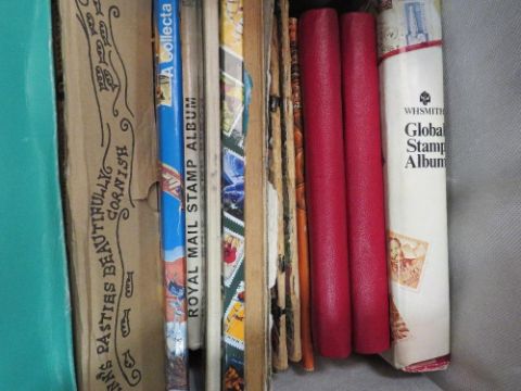 Eight small world stamp albums, two empty stamp albums, three boxes and a bag of loose stamps together with a full set of shell historic car coins