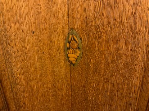 A Georgian oak cross banded corner, cupboard with shell inlay to the door