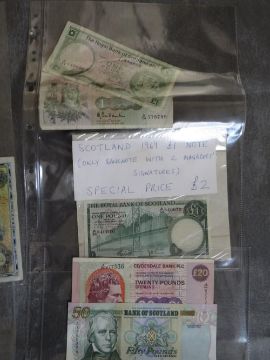 A collection of Scottish notes £1 - £100, to inlcude National Bank of Scotland 1945 £5, Bank of Scotland 1995 £50 and Clydesdale Bank 2001