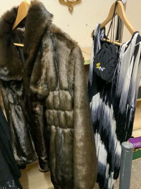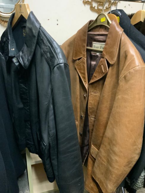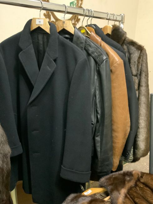 A vintage black 'Crombie' three-quarter length overcoat, together with two leather coats, a vintage two piece dress suit, a ladies faux fur jacket, a 1920s style fringed dress and a DKNY small bag etc.