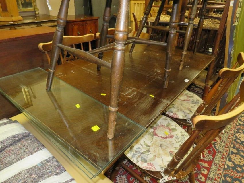 An oak refectory dining table with four chairs, and two other wheel back chairs A/F