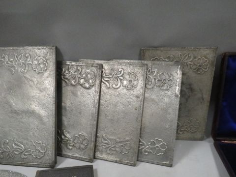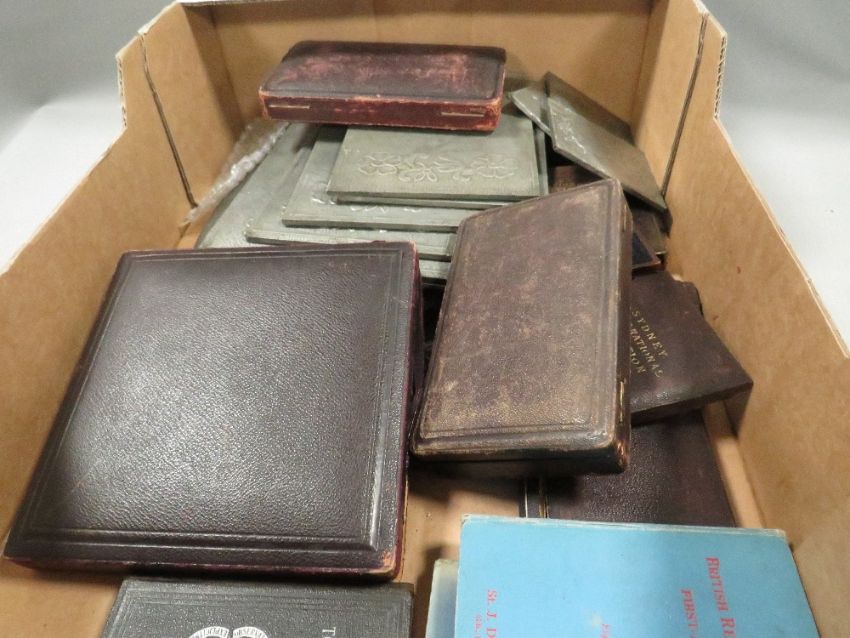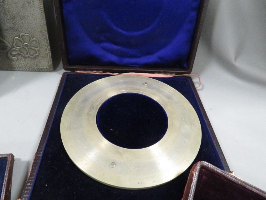 A tray of assorted cased medallions and collectables to include measuring instruments