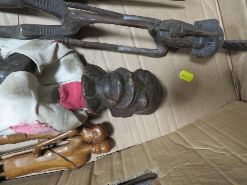 A pair of West African Senufo Ivory Coast tribal art figures, a pair of East African Antelope carvings, a Nigerian bowl dated 1944, a squatting African male elder figure and another pair of African figures