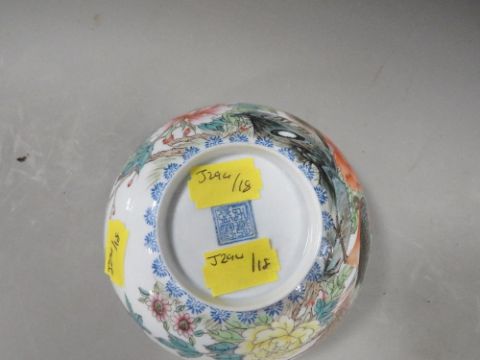Chinese Republic period eggshell Porcelain bowl enamelled with pheasants in a landscape blue Ruyi border, seal mark to underside Dia. 12.5 cm