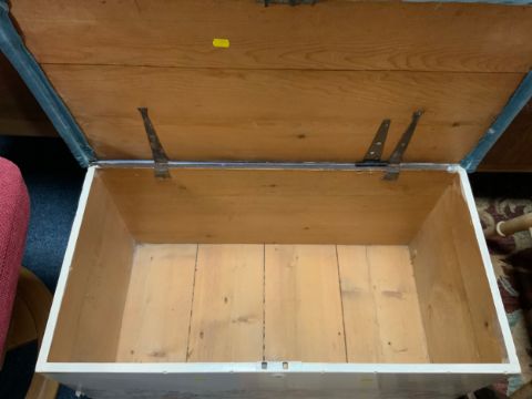 An upholstered pine traditional blanket box