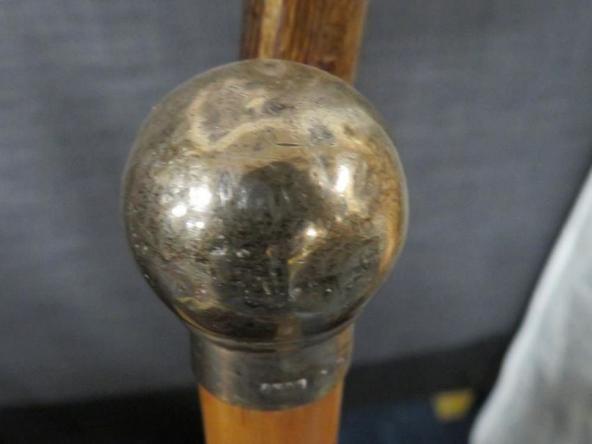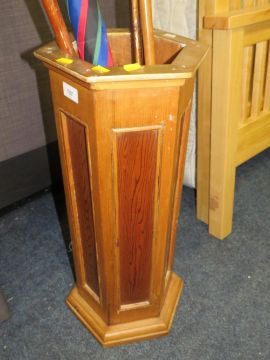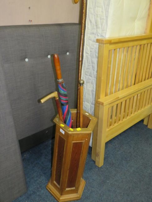 A vintage hexagonal stick stand with assorted sticks to include a hallmark silver top cane