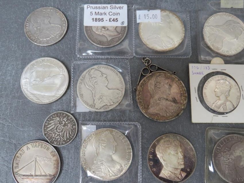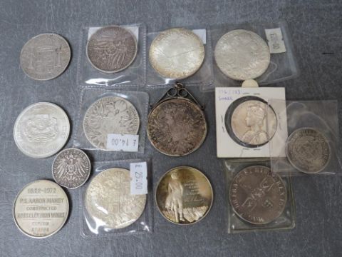 Various world medals and restrike coins etc., to include 5 Maria Thalers, a Prussia 1895 5 mark, 1937 Coronation and a William III 1696 crown with engraved initials (14)