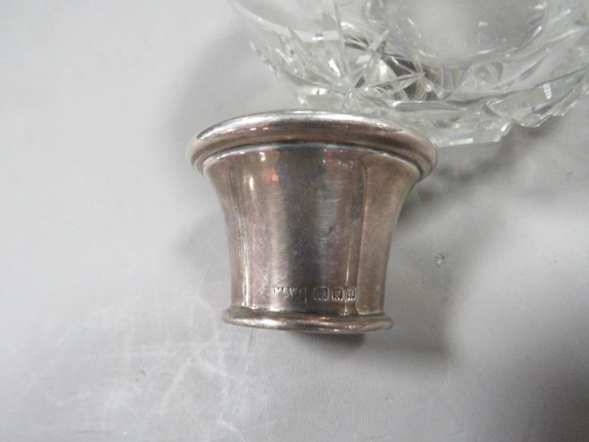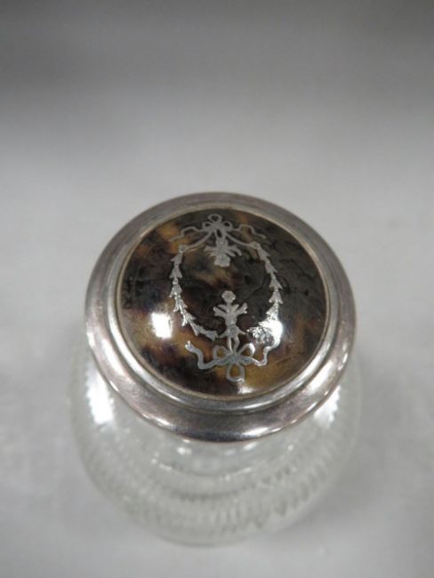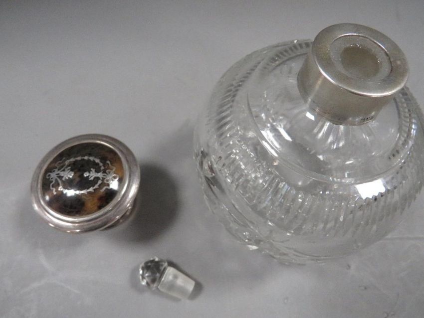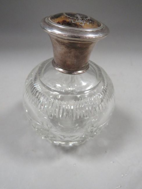 An antique silver pique mounted cut glass scent bottle H.M. London 1928