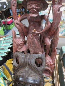 A tray of assorted treen etc. to include Oriental figures, tribal style masks etc