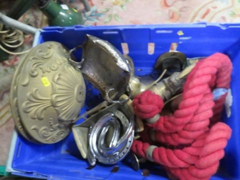 A tray of assorted metal ware to include a ceiling rose together with a rope bannister with brass fittings