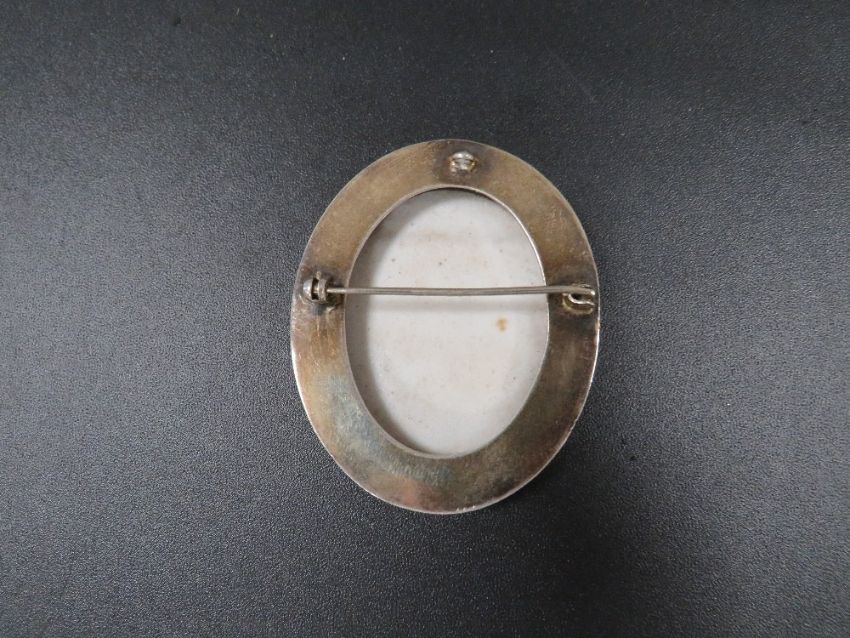 An antique painted porcelain Cameo brooch in silver frame