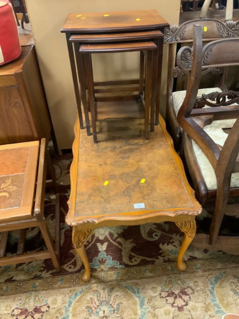 A walnut reproduction coffee table, and a mahogany nest of reproduction tables