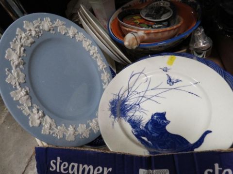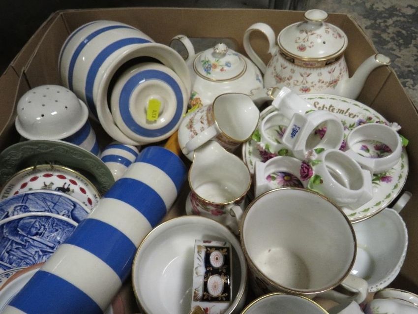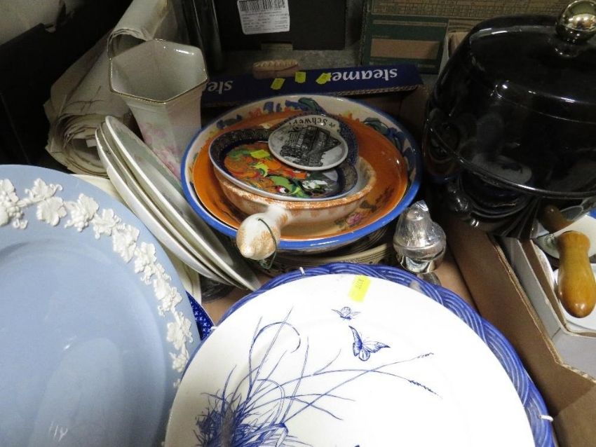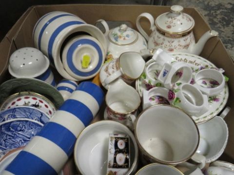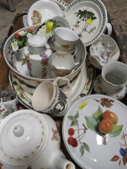 Three trays of assorted ceramics etc to include TG Green rolling pin, Portmeirion, Royal Worcester Evesham etc