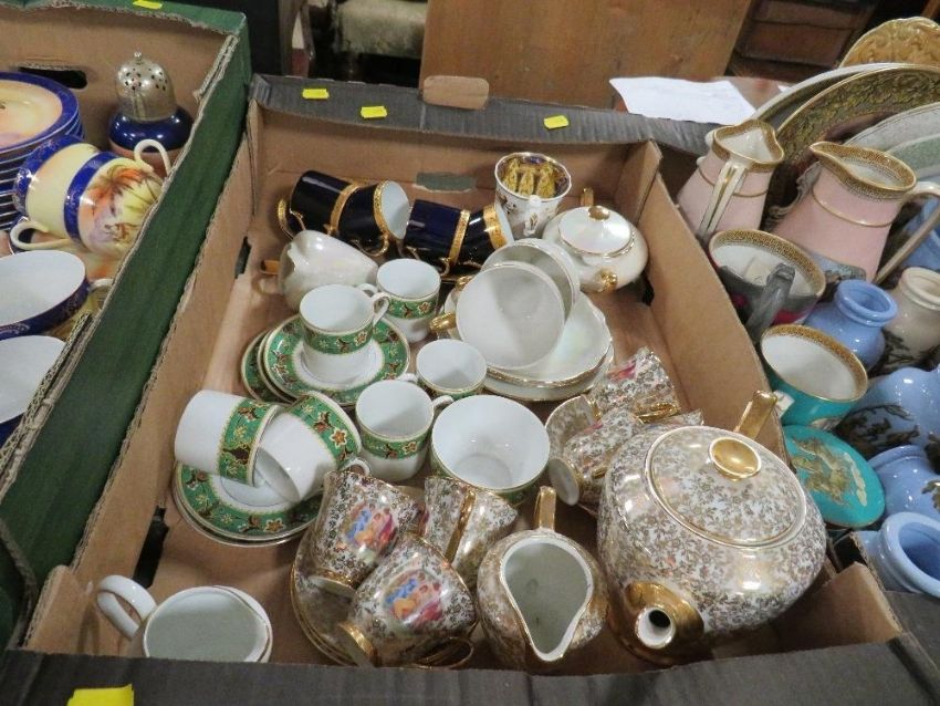 Three trays of assorted tea ware etc to include Limoges coffee cans and saucers, Royal Albert Elfin and a selection of SMF lobster plates