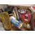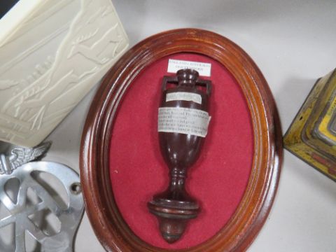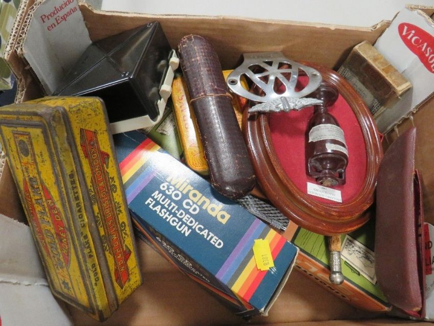 A tray of collectables to include vintage brass dominoes, AA badge, spectacles etc