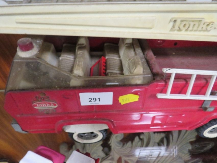 A vintage Tonka fire engine together with a modern Tonka buggy and Corgi Monkeemobile