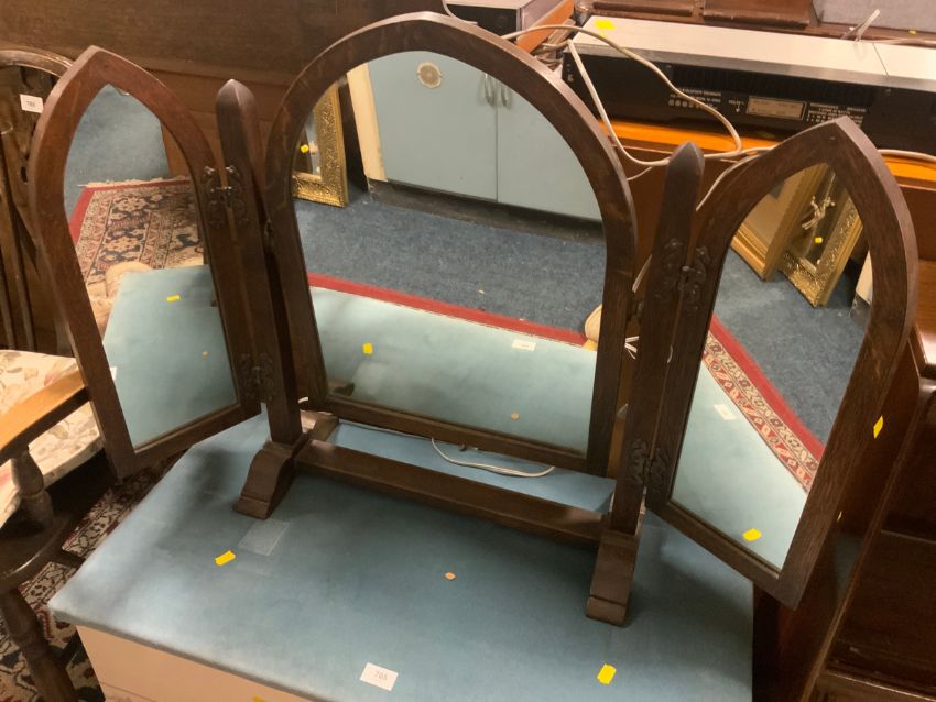 A pair of oak wheel back armchairs to go with an oak triple mirror