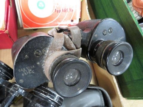 A tray of assorted collectables to include a pair of military binoculars with crows foot mark and a smaller pair of Ross military binoculars again with crows foot mark
