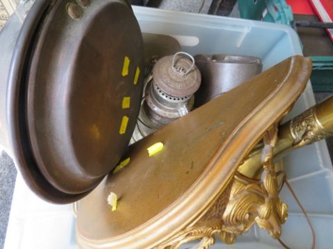 A tray of assorted metal ware to include a tilly lamp, brass table lamp etc., A/F