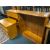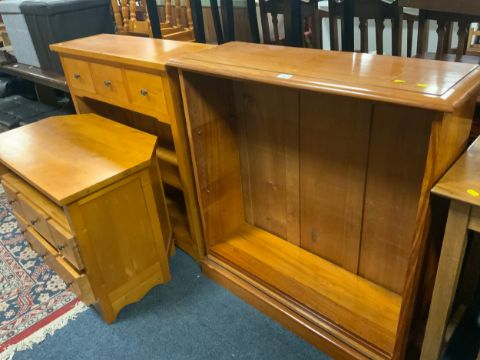 A modern cherry style open bookcase together with a TV media cabinet and another similar bookcase