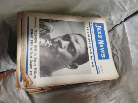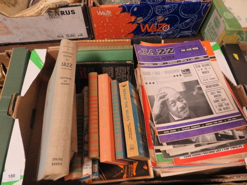 A tray of jazz related books and magazines together with a large quantity of jazz magazines contained in a shopping bag