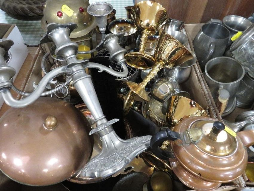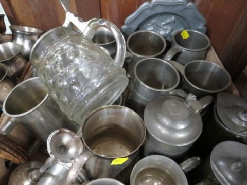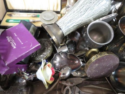 Four trays of assorted metal ware to include pewter tankards, silver plated placemats, flatware etc