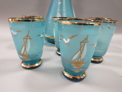 A mid century retro glass decanter with six shot glasses set having sailing ship design and gilt embellishment