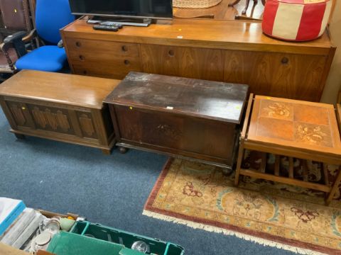 A reproduction oak linen fold blanket box together with another vintage blanket box and a mid-century teak tile top table
