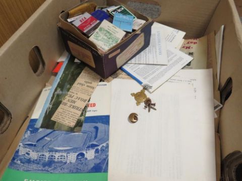 Two trays of collectables and ephemera to include a hallmarked silver collared hunting whip, a miniature cricket bat signed Ian Bell, a final tie Aston Villa v Manchester United Saturday, may 4th 1957 Empire stadium Wembley official programme