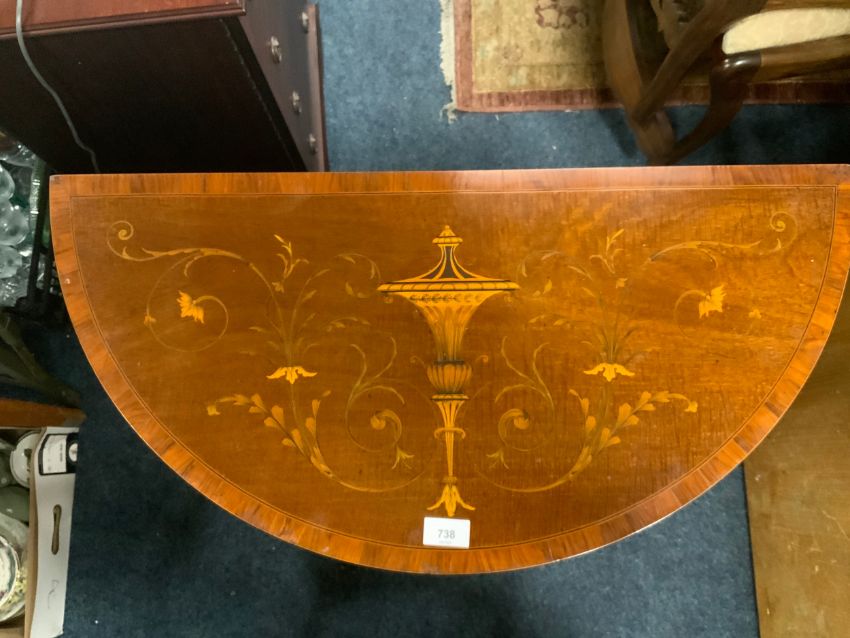 An antique mahogany and satinwood inlaid demi lune side table W 76 cm
