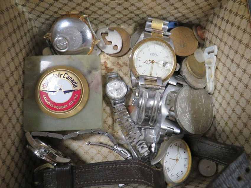 A box of vintage coins and watches together with a small box of costume jewellery