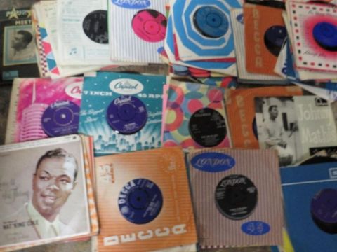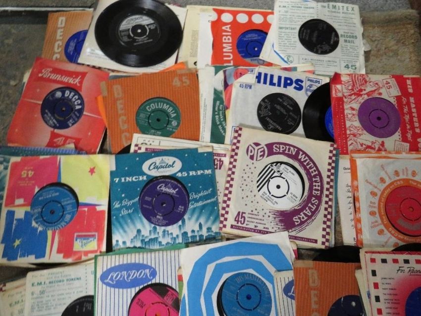 A tray of assorted single records to include Peggy Lee, Beatles etc