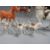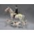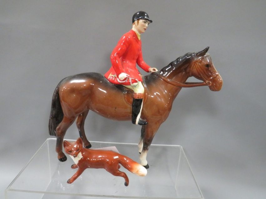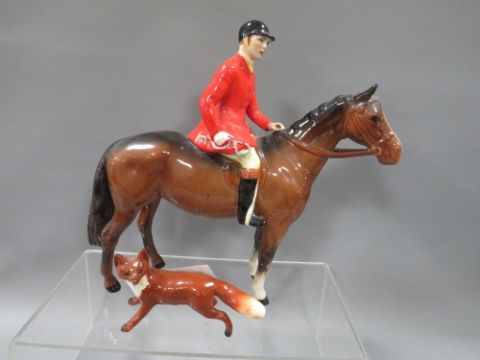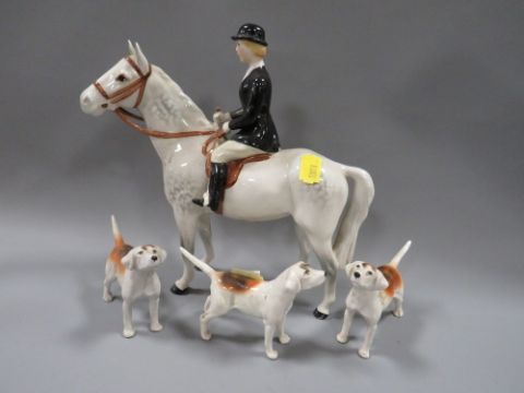 A Beswick hunting scene consisting of huntsman on bay horse, huntswoman on grey horse, three hounds and a fox, together with a palomino horse figure