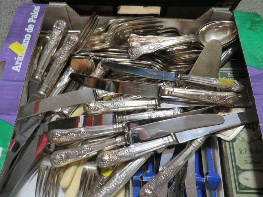 A tray of assorted metal ware etc together with a small tray of flatware to include Kings Pattern
