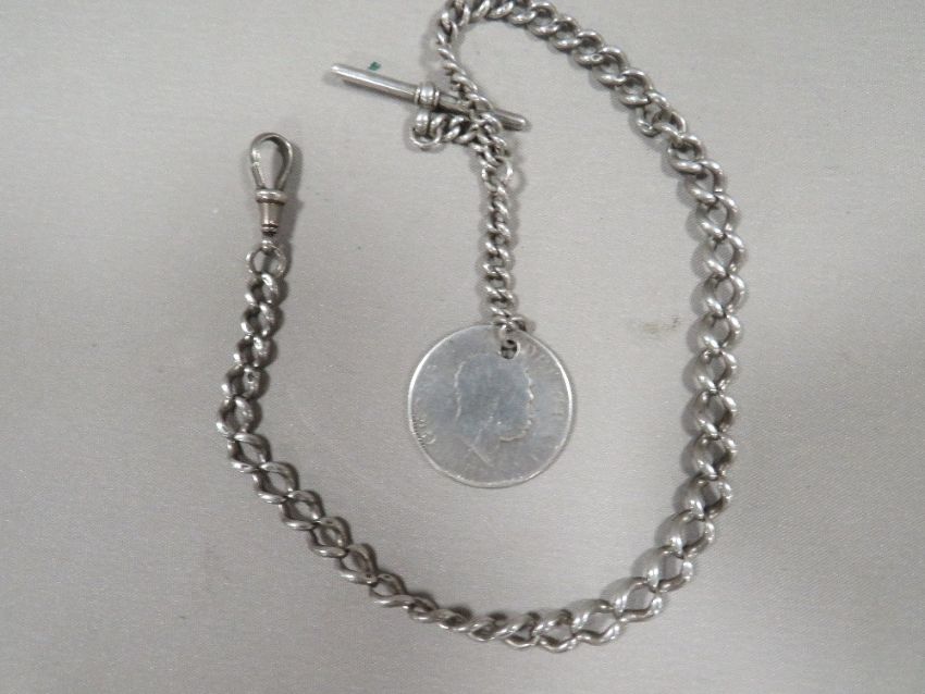 An antique silver gents pocket watch Albert chain