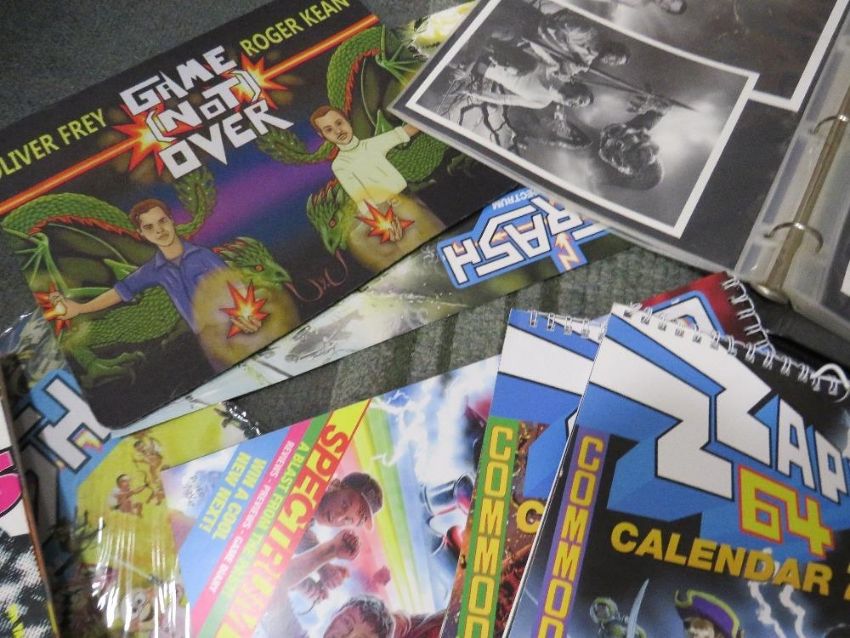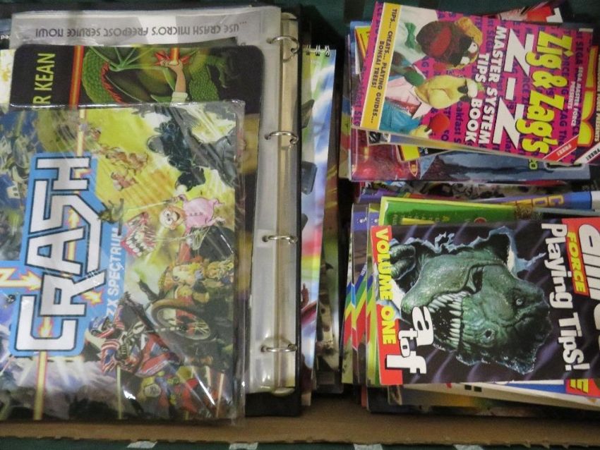 A tray of assorted retro gaming annuals, magazines, books, calendars etc., to include Crash ZX Spectrum itmes. Mega Machines, Fusion. Crash Micro Action, Tips Force. ZZap 64, Freeze 64 etc., plus a scrap book containing The Lost World by Sir Arthur Conan Doyle adventure story sheets from 1962