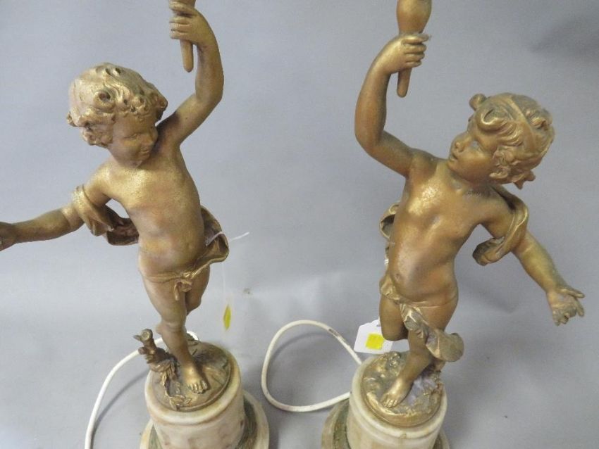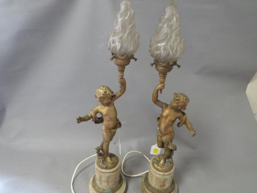 A pair of gilt metal French style table lamps with flame shades A/F