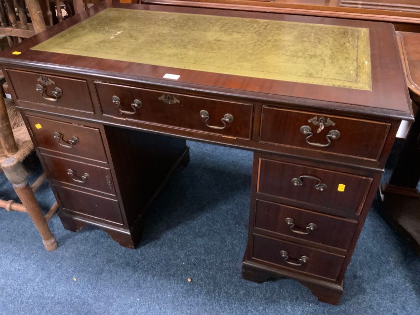 A reproduction mahogany twin pedestal desk with green tooled leather top W 110 cm