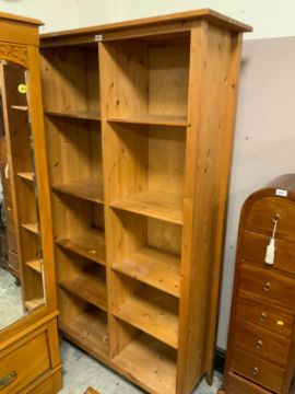 A modern honey pine open double bookcase
