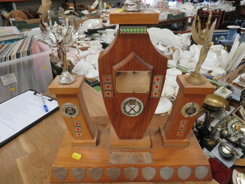 Two trays of trophies mainly for rifle shooting etc.