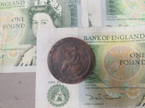 Five £1 notes, One 10 shilling note, 1797 Penny
