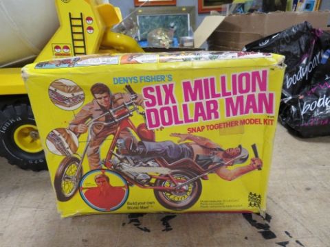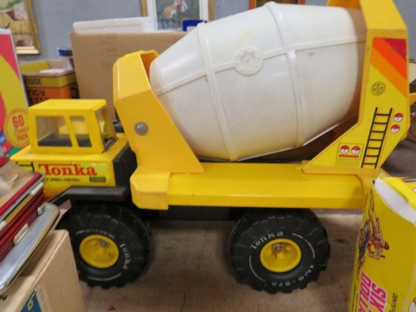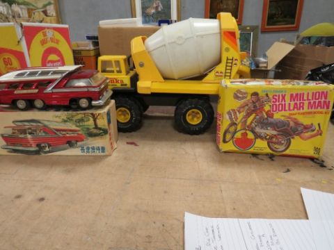 A LARGE TONKA TURBO DIESEL CONCRETE MIXER, a 1960s Chinese made tin plate bus together with a boxed Six Million Dollar Man snal together model kit by Denys Fisher, contents unchecked
