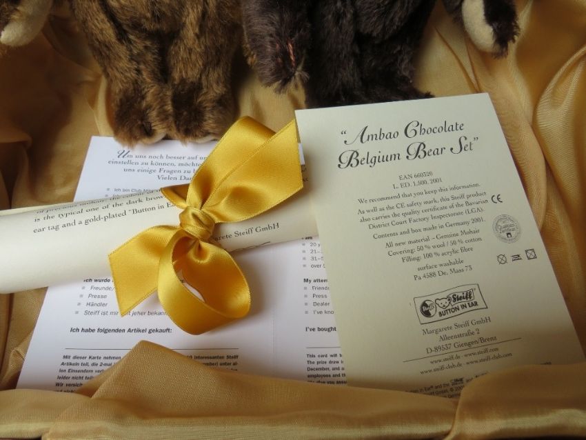 A BOXED SET OF STEIFF LIMITED EDITION 'AMBAO CHOCOLATE BELGIUM BEAR SET', EAN 660320. limited edition of 1500, complete with certificate