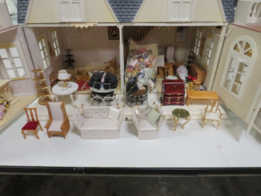 A LARGE MODERN DOLLS HOUSE, approx. W 70 cm, D 44 cm and H 60 cm, together with a large quantity of dolls house furniture