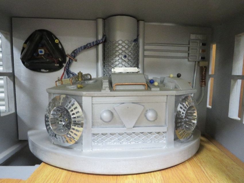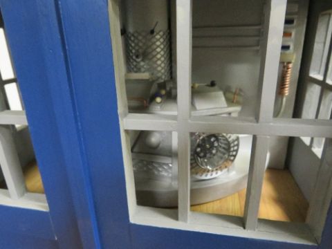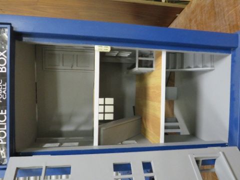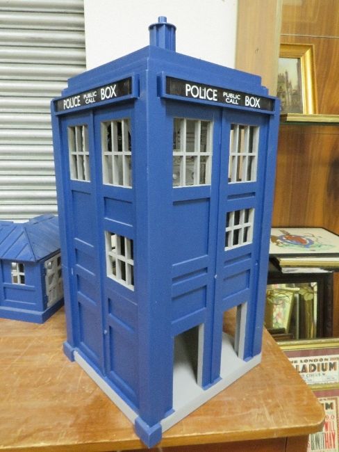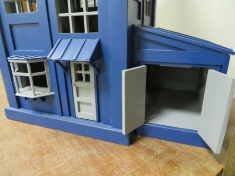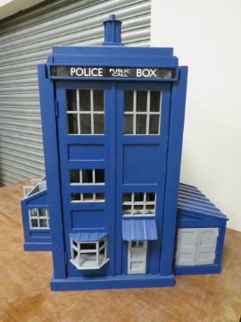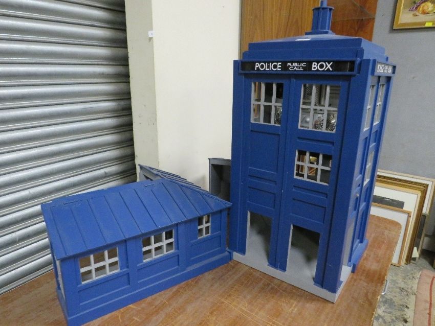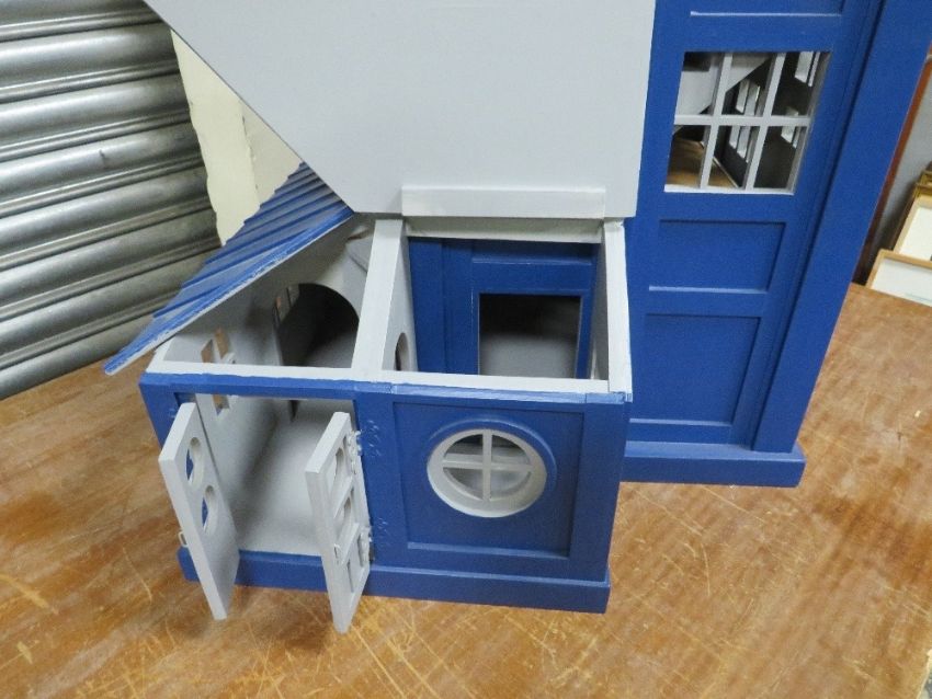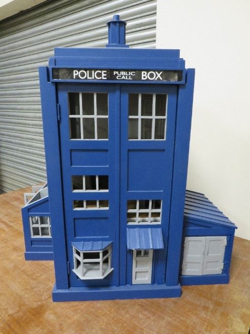 DR WHO INTEREST - A SCRATCH BUILT DOLLS HOUSE IN THE FORM OF THE TARDIS, with various detachable outbuildings, approx. H 85 cm, W 75 cm, D 68 cm