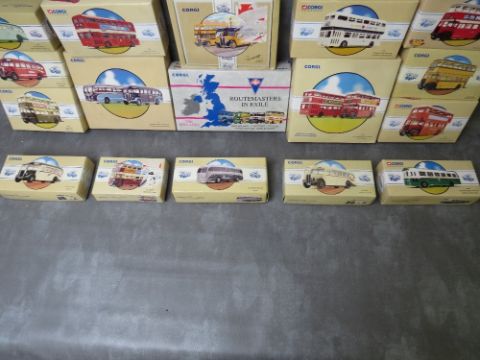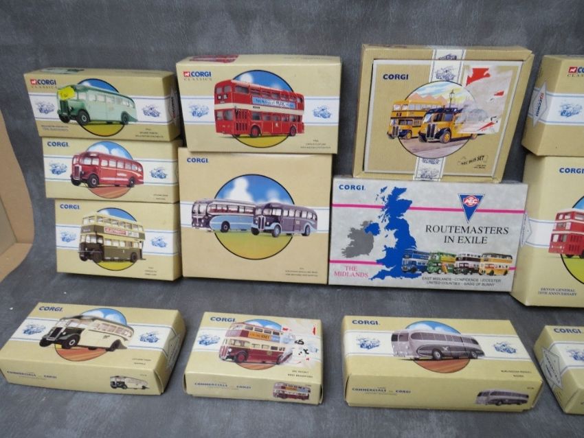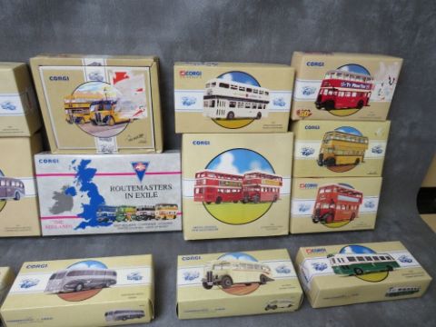 SEVENTEEN BOXED CORGI BUSES / COACHES, to include Routemasters In Exile The Midlands four pack 97067, Devon General 75th Anniversary 97052, York Brothers Northampton coach twin pack 97053, Midland Red Double Decker 97311 etc.